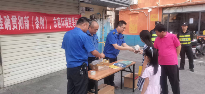 执法队工作人员分别在小区、城中村和商圈附近摆摊设点,面向企业、居民和游客等不同人群发放宣传折页,通过面对面交流,详细耐心解释条例修订后变化,化解矛盾、增进了解。同时,执法队也在辖区各宣传栏张贴新《条例》宣传海报,最大限度向市民宣传法律知识,让市民熟知市容条例。
