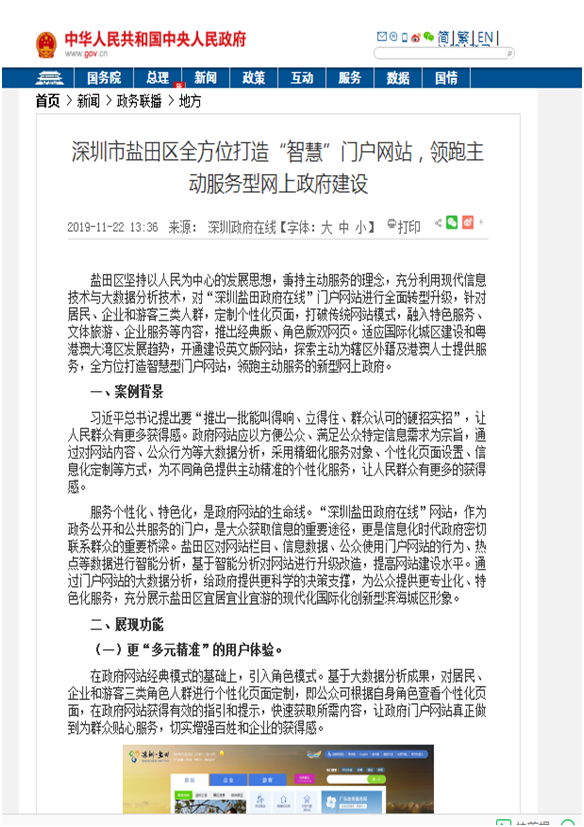 (四)完善平台建设,推动政府网站改版升级。升级盐田政府在线,推出经典版、角色版双网页,群众根据居民、企业、游客的不同身份,自由切换个性化页面,获取更有针对性的信息服务和指引提示。采用最新HTML5技术,建设政府网站数据分析与决策系统,对网站栏目、信息数据、公众使用行为、社会热点等进行智能化分析,形成政务信息和服务需求清单,将群众最关心问题置顶推送,并根据用户浏览记录,精准推送政务资讯。丰富使用体验,通过视频直播、图文直播、动漫解读等形式解读政务信息,对区内大型政务活动(党代会、两会)、新闻发布会、大型活动(文博会、旅游节)进行视频和图文直播。绘制服务地图,开通语音导航、语音搜索等功能,提供智能化服务导航。2019年,网站浏览量7,663,463,同比增长40.7%;访客数量2,058,462,同比增长44%;公共搜索收录量上升至98,425。