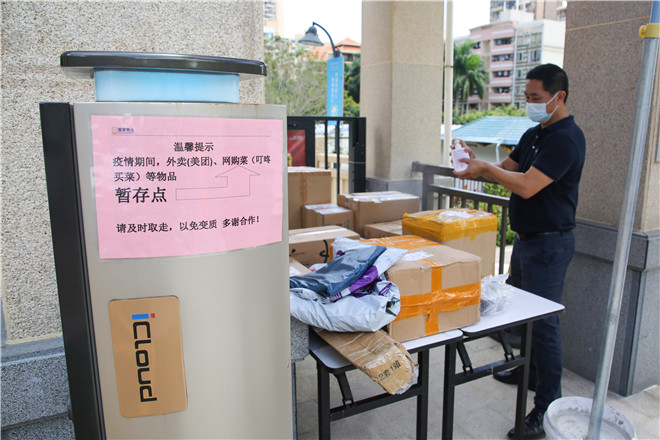 上善梧桐苑小区物业人员对暂存点快件进行集中消杀