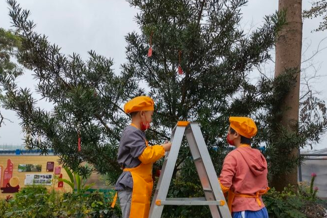 为了烘托节日氛围,亲子家庭还用一些红色的愿望卡来装饰花园,以此祝愿在新的一年红红火火,平安顺遂。“小梅沙社区由于没有花市和花店,到共建花园种年花让小孩体验到了不一样的年味,同时厨余垃圾堆肥又让孩子学到了环保知识,非常有意义。”居民刘先生一边教女儿怎么施肥,一边说:“大人也很愿意参与这类户外亲子活动。”