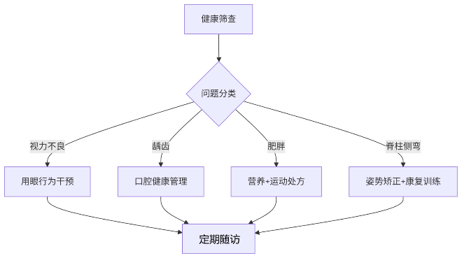 整合医疗机构、学校、家庭、社区等多方力量,遵循自愿参与原则,为有需要的儿童制定干预计划,如个性化膳食调整方案、科学运动处方等,开展健康干预、营养指导、中医调理等综合干预措施,对筛查中发现的达到转诊标准的疾病患者,协助转诊至上级医院进行进一步诊疗。