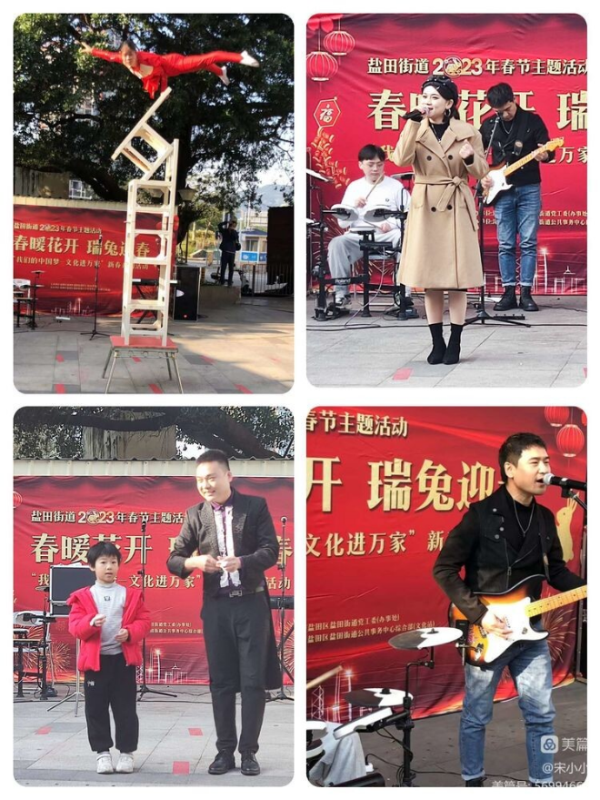 春节不打烊,送福进社区!为丰富留深过节人员和辖区居民新春佳节生活,渲染浓浓的喜庆和谐节日文化氛围,共同度过一个喜庆祥和的中华传统文化节日,由盐田街道党工委(办事处)主办,街道公共事务中心综合部(文化站)承办的“春暖花开•瑞兔迎春”文艺演出,在1月25日和1月26日连续组织两场公益送进社区。