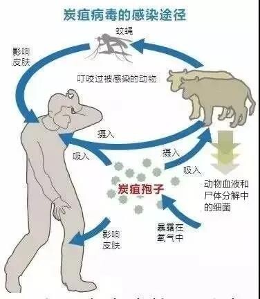 以上就是炭疽杆菌感染循环的过程,可见芽胞是循环的中心。捕食病畜的狼等肉食动物也会感染,但罕有暴发。人类会因为接触患病动物(尸体、皮毛)、食用感染肉类以及吸入带菌气溶胶而感染。恐怖分子用炭疽杆菌作恶正是利用了它易于存活和传播的特点。