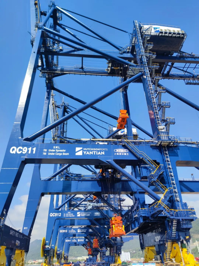 目前,该项目一期工程正在加速推进中。码头主体及护岸工程已完成68.36%,道堆工程累计完成34.2%,中控楼项目完成4.2%。第一批2台岸桥已于10月下旬到岸安装,第二批3台岸桥也于11月中旬到岸安装。