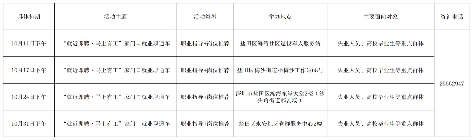 盐田区举办就业指导+就业直通车活动。10月就业直通车将举办4期,通过职业指导和岗位推荐,打造“指导+就业”的有效闭环,着力推进辖区登记失业人员、就业困难人员等重点群体就业服务工作。