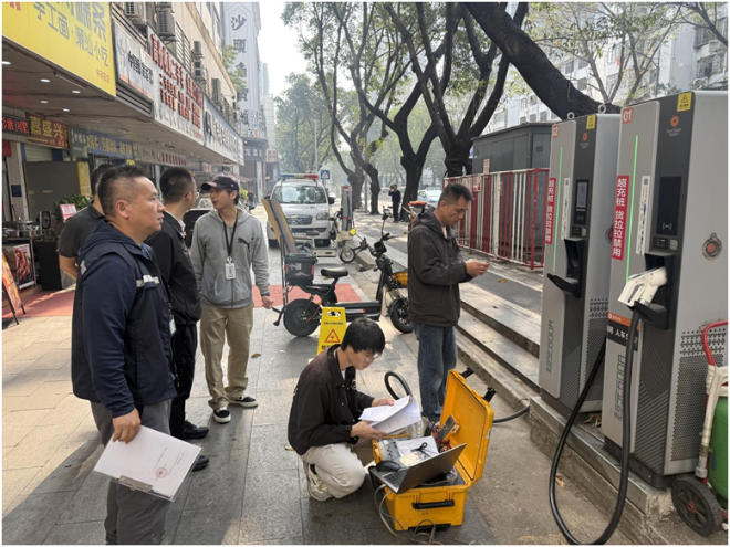为落实区安委办关于加强重点时段安全生产防范工作有关要求,保障残特奥会及岁末年初期间辖区新能源汽车充电设施安全平稳运行,结合近期沙头角街道办来函反馈群众反映沙头角三环大厦充电站、供电设施、燃气管道与充电桩间距可能存在安全隐患问题,近日,区发展改革局带队,组织区住房建设局、沙头角街道办、盐田供电局、深圳市燃气集团股份有限公司及第三方专业检测机构开展重点时段安全生产专项整治-新能源汽车充电设施安全检查工作。