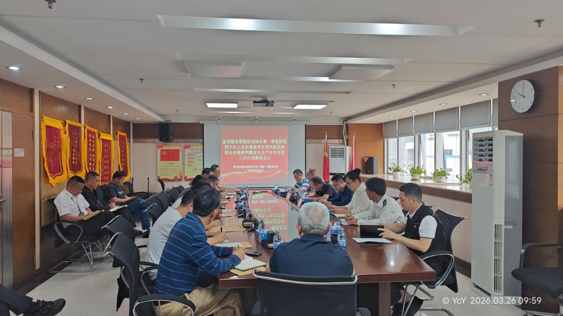 2026年3月26日上午,盐田综保区服务中心党组书记黄宇冬主持召开盐田综合保税区2026年第一季度防范较大以上安全事故和灾害风险形势综合会商研判暨安全生产治本攻坚三年行动推进会。会议通报了盐田综保区2026年第一季度安全生产总体情况,传达学习了上级相关文件精神,开展了生产安全事故警示教育,部署了二季度工作,安排了安全生产治本攻坚三年行动相关推进事项,并与企业代表签订了《盐田综合保税区2026年安全生产责任书》。中心主任谢晓等领导,梅沙海关、盐田街道应急办、园区安委会成员单位及业主企业负责人参加了会议。