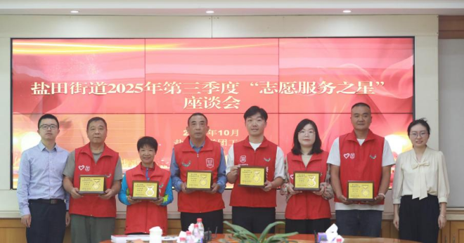 10月29日下午,盐田街道团工委组织召开2025年第三季度“志愿服务之星”座谈会。会上,街道党工委委员、党建和组织人事办公室主任陈凯斌为优秀志愿领队和优秀志愿者颁发荣誉奖章,表彰他们在交通劝导、电动自行车秩序治理、市容环境提升、小区服务等工作中做出的奉献。7名志愿者代表分享了各自的服务故事与心路历程。下一步,街道团工委将围绕街道中心工作和群众需求,持续优化服务、拓展领域、打造品牌,广泛动员社会力量加入志愿行列,为辖区高质量发展贡献温暖坚实的“志愿力量”。