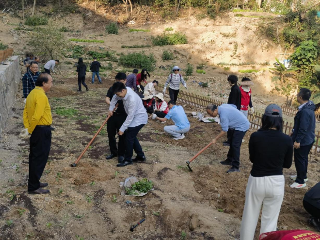 在推进过程中,项目坚持党建引领,夯实长效根基。社区党委专门设立“红色沃土”党员示范田,并与生态环境部华南环境科学研究所、市生态环境局盐田管理局等党组织联动共建,将科普园打造成生态文明实践阵地。今年植树节期间,多方党支部联合农工民主党、万科公益基金会等力量,在此共同开展“党建引领减污降碳社区示范种植”活动,50余名党员志愿者携手栽下向日葵、辣椒、艾草等作物,将绿色低碳理念播撒进社区土壤。