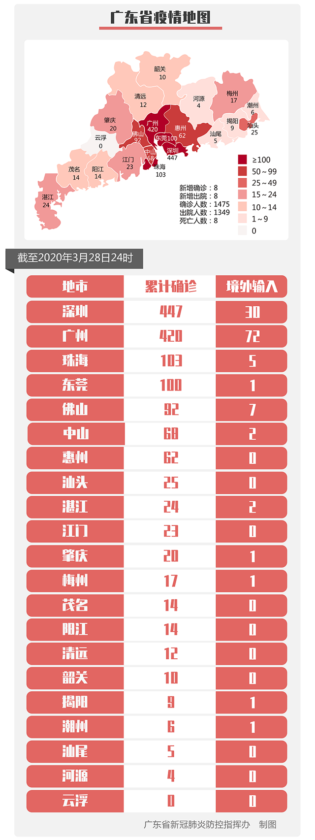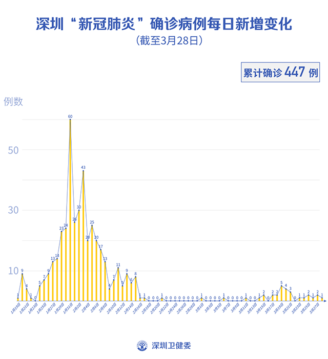 截至3月28日24时,深圳累计报告“新冠肺炎”病例447例。3月28日当天新增1例。