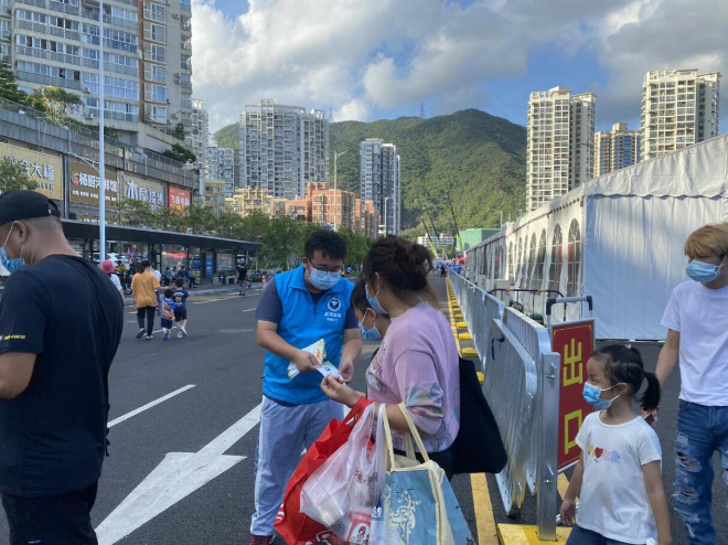 6月19日,盐田街道综治办禁毒社工坚持禁毒与防疫相结合的工作模式,联合社区治安专员到各社区核酸检测临时点开展“疫情防控不放松,禁毒宣传不打烊”禁毒宣传活动。