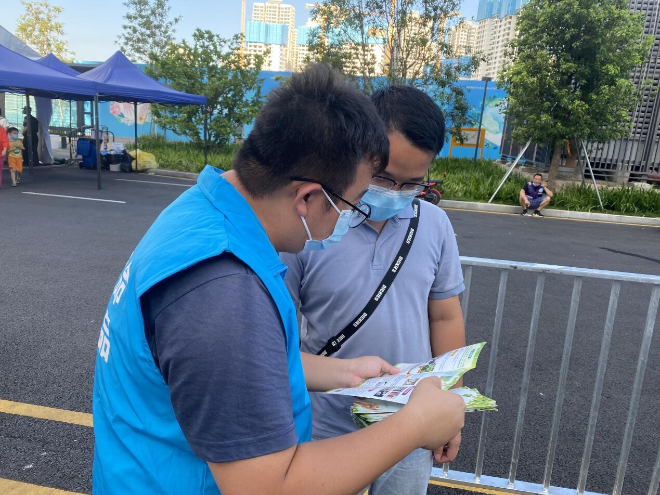 禁毒社工现场协助核酸检测工作,并在核酸检测出口处为居民派发禁毒宣传单张,向已做完第五轮核酸检测的居民和工作人员讲解毒品的危害,尤其是新型毒品的基本知识、种类以及对青少年的危害。