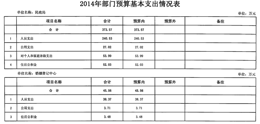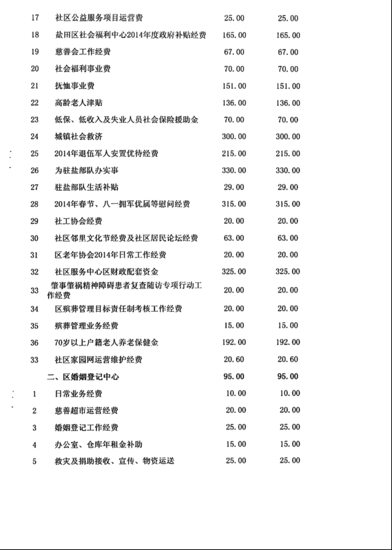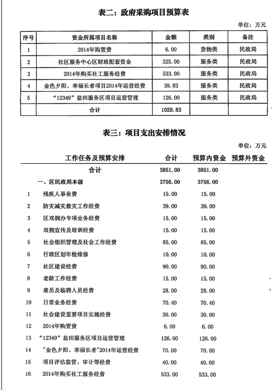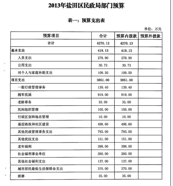 经盐田区四届人大三次会议审议通过,根据盐田区财政局《关于批复2014年度部门预算的通知》(深盐财预[2014]36号),盐田区民政局2014年度经费支出总预算为4270.13万元,其中:财政预算内资金安排4270.13万元,预算外资金安排0万元。具体情况如下: