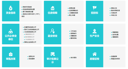 一是着力推进资金信息、公共资源配置、重大项目批准和实施、社会公益事业建设等重点领域信息公开。其中公开区政府及部门预决算信息、财政专项信息等资金信息;公开住房保障、房屋征收、政府采购、工程建设项目招投标等公共资源配置信息;公开重大建设项目计划、重大建设项目实施进展、投资额、招标投标信息等重大建设项目批准和实施信息;公开就业创业、生产安全、社会救助、扶贫工作、环境保护、学校、医疗卫生、文化机构、国有企业等社会公益事业建设领域信息。