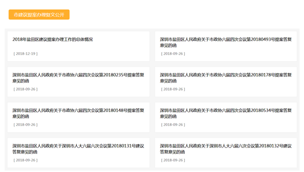 四是完善两会办理公开工作机制,在“盐田政府在线”门户网站主动公开人大、政协代表建议、提案的办理情况,其中2018年向社会公开建议提案办理复文16篇,并对外公开2018年盐田区建议提案办理的总体情况。