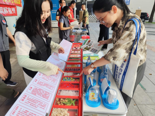 活动现场,工作人员设置禁毒宣传点位,通过发放宣传册、展示毒品仿真模型、讲解典型案例等方式,向来往居民宣传毒品的种类、危害及其对个人、家庭和社会造成的严重影响。社工特别围绕当前常见的新型毒品进行重点讲解,提醒群众警惕伪装成“奶茶包”“上头电子烟”“大麻饼干”“跳跳糖”等新型毒品,通过揭示其伪装性强、迷惑性高的特点,帮助大家提升识别能力和防范意识,避免在不知情的情况下误触毒品。社工还向居民讲解了于2025年1月1日起施行的《深圳经济特区禁毒条例》相关内容,增强群众对禁毒法律知识的了解,倡导“健康生活,远离毒品”的理念,营造全民参与禁毒的良好氛围。