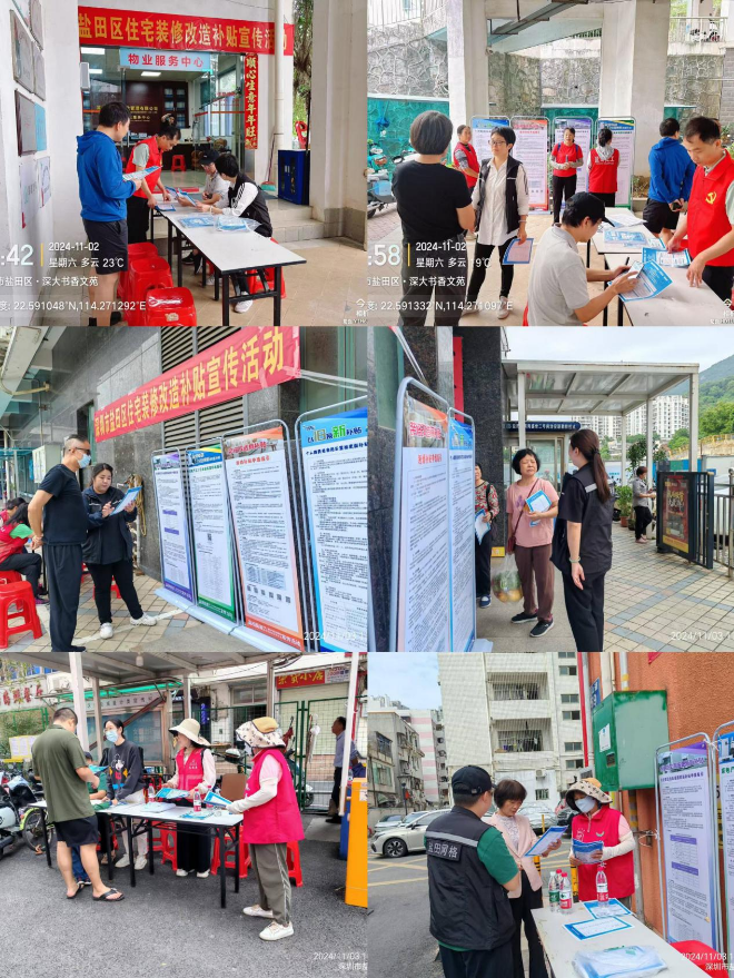 11月2日、3日两天,盐田街道在盐田社区书香文苑、蔚蓝假日雅苑和金海雅居住宅小区开展深圳市盐田区住宅装修改造补贴现场宣传活动。